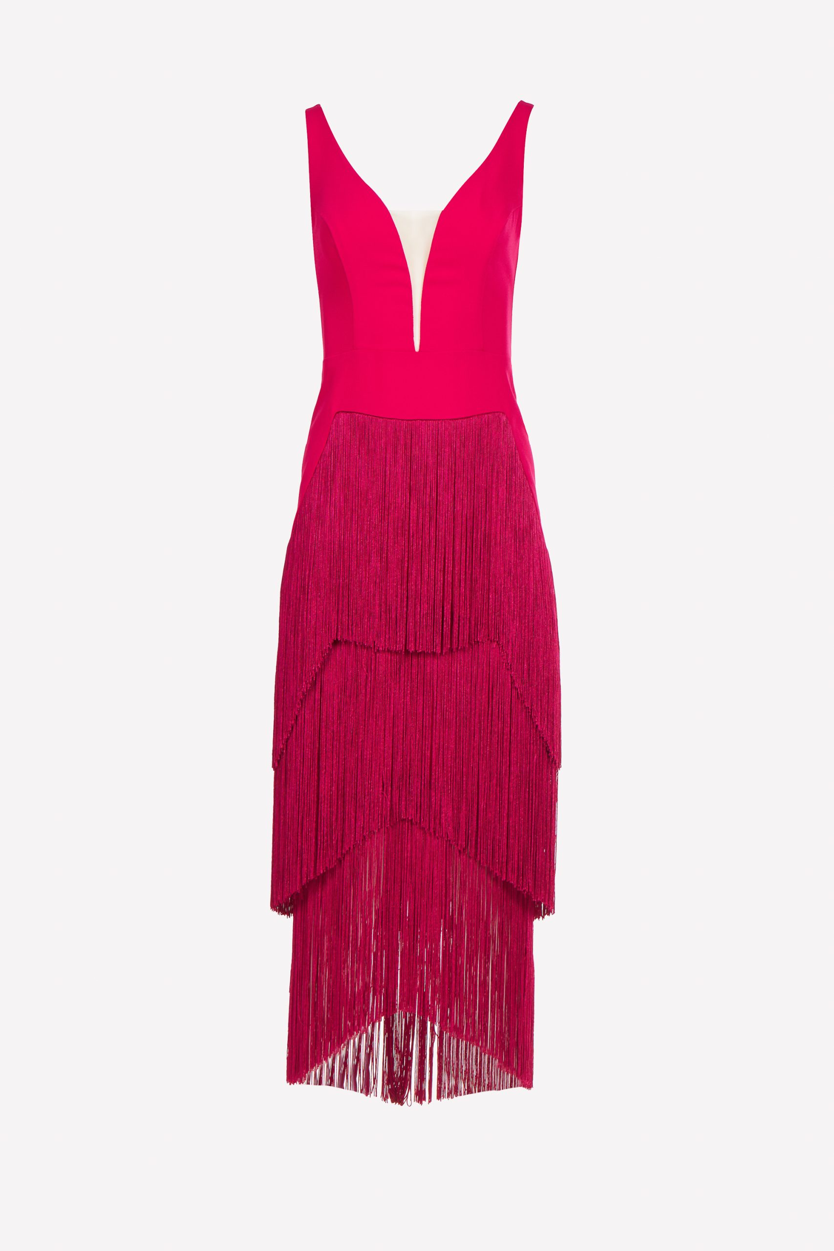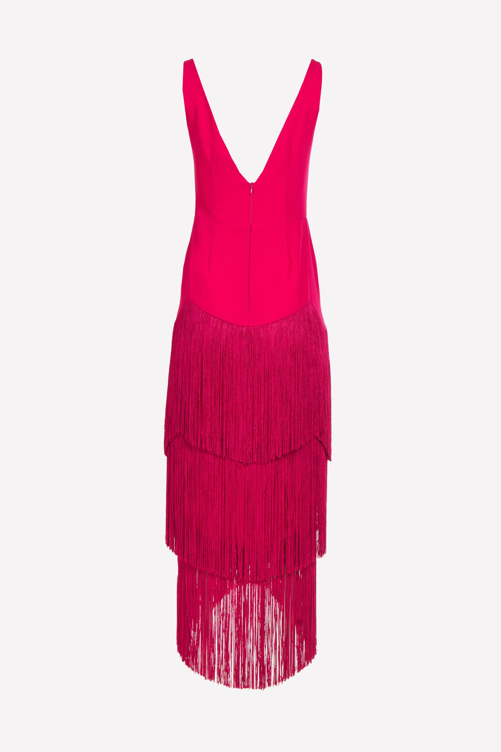 A dress made to move. This vibrant fuchsia midi features a sculpted V-neck bodice that flatters the figure and a skirt adorned with cascading layers of fringe for striking texture and playful rhythm. Perfect for events where you want to dance, dazzle, and turn heads.